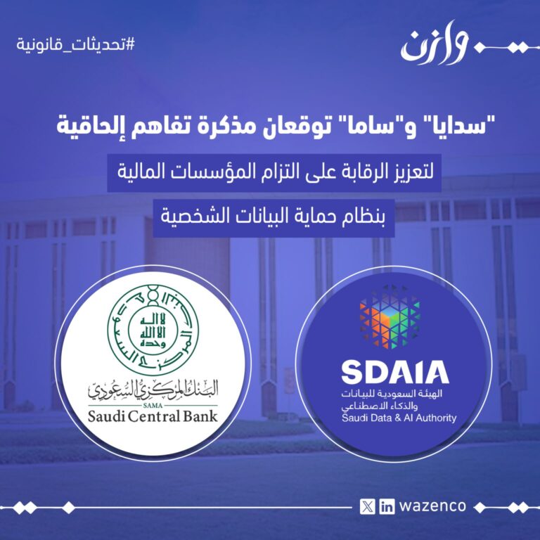 الهيئة السعودية للبيانات والذكاء الاصطناعي SDAIA | سدايا والبنك المركزي السعودي “ساما” مذكرة تفاهم إلحاقية في مقر “سدايا” بالرياض، وذلك لتنظيم آليات وإجراءات الرقابة والإشراف على مدى التزام المؤسسات المالية بأحكام نظام حماية البيانات الشخصيةWazenco10 فبراير 2025وقّعت الهيئة السعودية للبيانات والذكاء الاصطناعي SDAIA | سدايا والبنك المركزي السعودي "ساما" مذكرة تفاهم إلحاقي ... اقرأ المزيد
