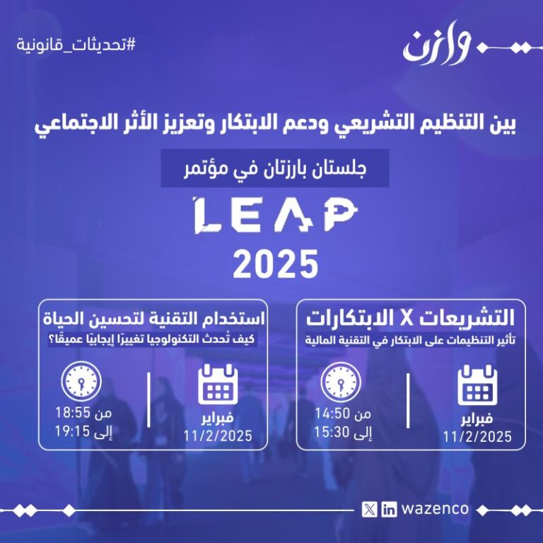 بين التنظيم التشريعي ودعم الابتكار وتعزيز الأثر الاجتماعي جلستان بارزتان في مؤتمر LEAP 2025Wazenco11 فبراير 2025يشهد مؤتمر ليب 2025، الحدث التقني الأبرز عالمياً، تقديم جلسات حصرية حول دور التشريعات في تعزيز الابتكار في التق ... اقرأ المزيد