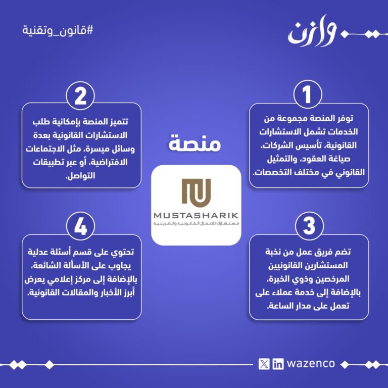 منصة MUSTSHARIKWazenco19 يونيو 2025منصة مستشارك هي منصة سعودية متخصصة تقدم خدمات قانونية شاملة للأفراد والمنشآت داخل المملكة العربية السعودية و ... اقرأ المزيد