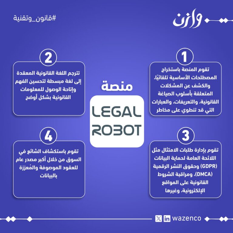 منصة Legal Robot Wazenco26 يونيو 2025تُعد منصة Legal Robot من المنصات الرقمية الرائدة في مجال التحليل القانوني القائم على الذكاء الاصطناعي، حيث تهدف إ ... اقرأ المزيد