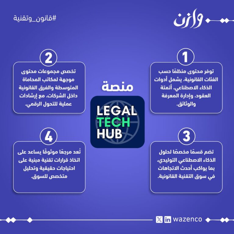منصة Legal Technology HubWazenco22 يوليو 2025تُعد منصة Legal Technology Hub من أبرز المنصات المتخصصة في تمكين المؤسسات القانونية من الوصول إلى حلول التكنولوجيا ال ... اقرأ المزيد