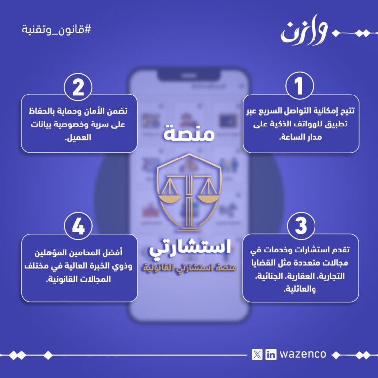 منصة estishartiWazenco1 مايو 2025منصة "استشارتي" هي منصة قانونية سعودية تقدم خدمات واستشارات قانونية عن بُعد، وهي الوجهة المثلى لتلبية احتياجا ... اقرأ المزيد