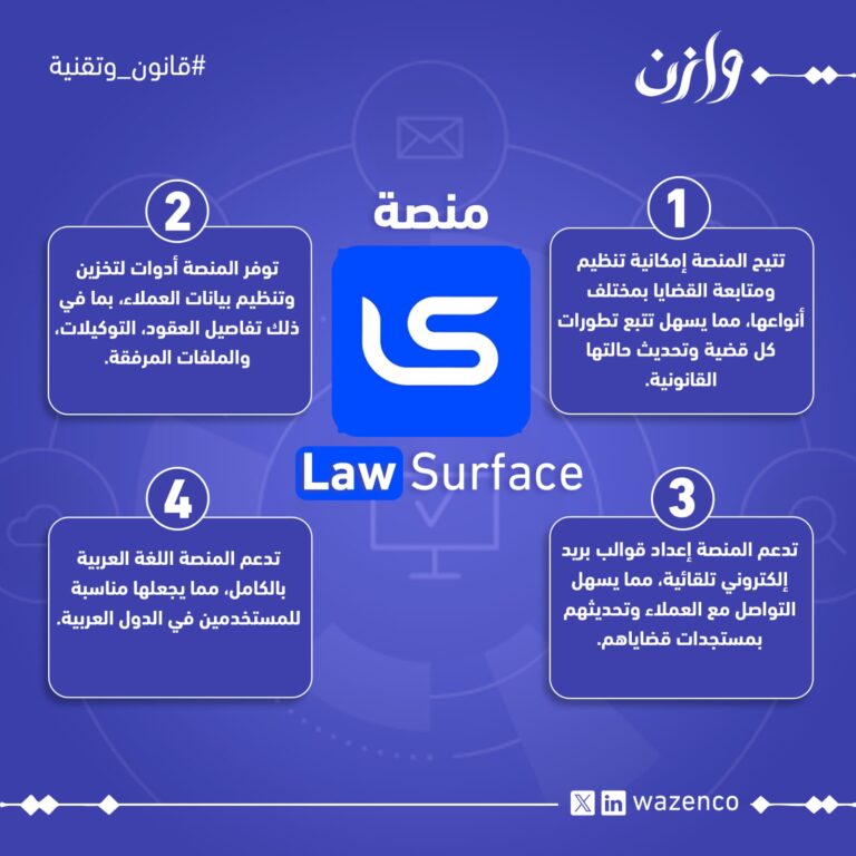 منصة Law SurfaceWazenco15 مايو 2025منصة لو سيرفس تُعد من المبادرات الرقمية الرائدة في مجال دعم العمل القانوني في العالم العربي، حيث تقدم حلاً تق ... اقرأ المزيد