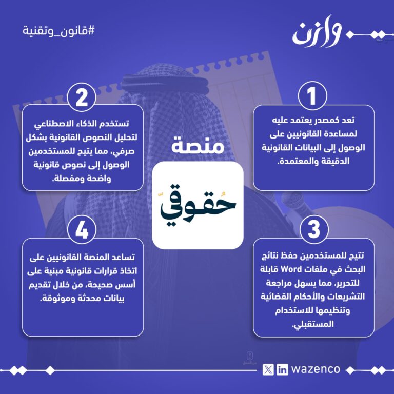 منصة HoqoqiWazenco22 مايو 2025منصة "حقوقي" هي منصة رقمية سعودية متخصصة في البحث القانوني، وتهدف إلى تزويد المحامين والباحثين القانونيين وا ... اقرأ المزيد
