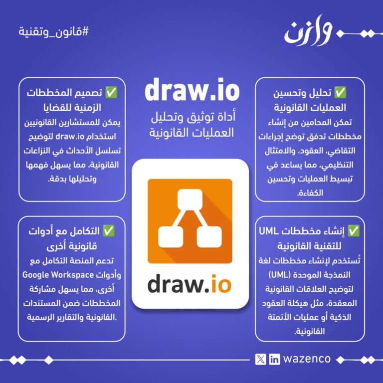 منصة Draw.ioWazenco23 مارس 2025تُعد draw.io (المعروفة أيضًا باسم Diagrams) منصة هيكلية تساعد على التركيز ورسم خطة لمسار القضايا والترافع فيها، وتعمل ... اقرأ المزيد