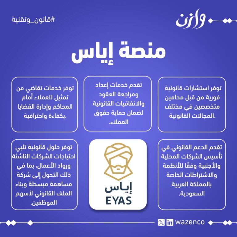 منصة إياس EyasWazenco23 مارس 2025منصة إياس هي منصة قانونية مبتكرة تهدف إلى تسهيل الوصول إلى المحامين المتخصصين بسرعة وكفاءة، مما يمكن الأفراد ... اقرأ المزيد