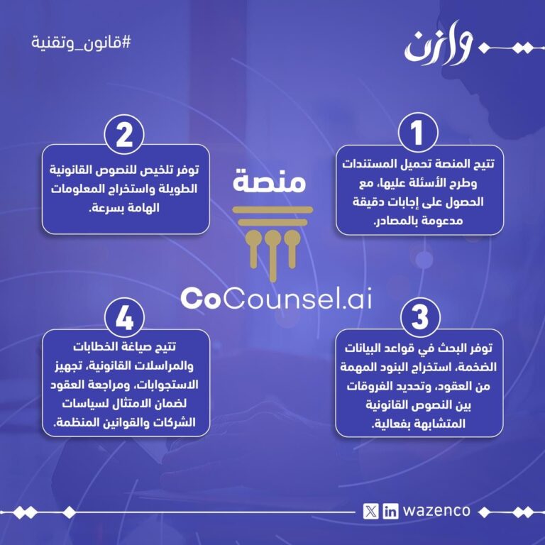 منصة كوكاونسل كور Cocounsel CoreWazenco12 أبريل 2025كوكاونسل كور هي منصة قانونية مبتكرة تعتمد على الذكاء الاصطناعي التوليدي (GenAI) لتسهيل عمليات البحث القانوني، م ... اقرأ المزيد
