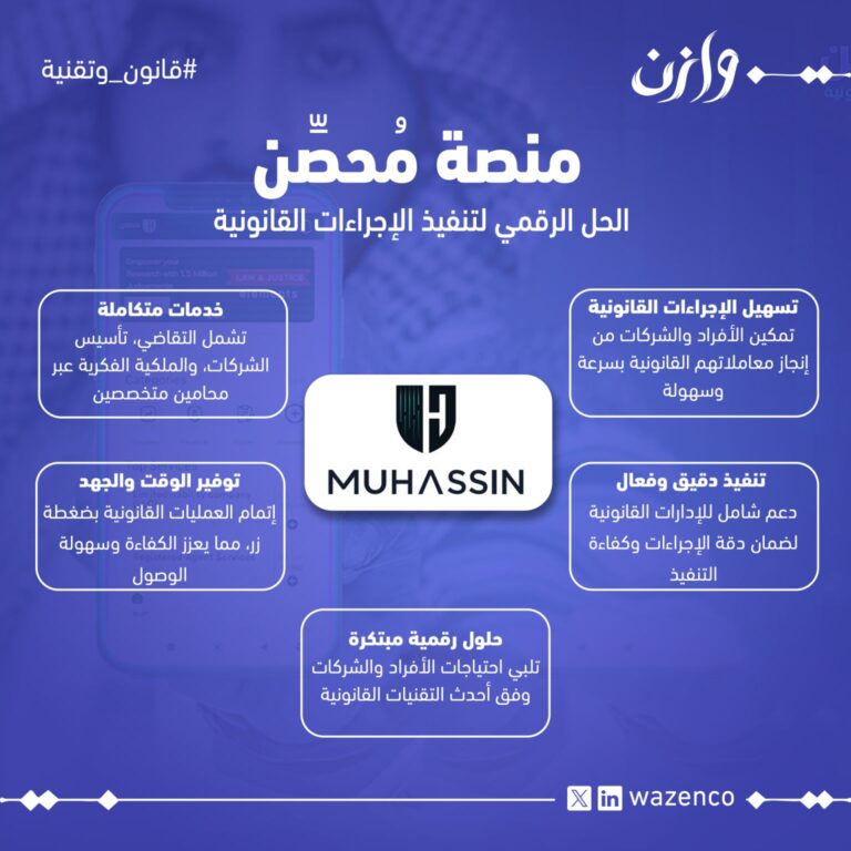 منصة محصن MuhassinWazenco25 مارس 2025منصة محصن Muhassin هي منصة رقمية مبتكرة تهدف إلى تسهيل وتنفيذ الإجراءات القانونية للأفراد والشركات في المملكة ال ... اقرأ المزيد